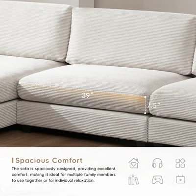 Transform your living space with our 134-inch wide oversized L-shaped corduroy sectional sofa, designed to offer both luxurious comfort and striking visual appeal. The ultra-thick corduroy fabric enhances the sofa’s overall coziness and aesthetic, making it a perfect centerpiece for any room. With extra-wide seats and a chaise lounge, this sectional provides ample space for relaxation. Equipped with cup holders and USB charging ports, it blends convenience with style. Built with a sturdy wooden frame, this sofa is designed for durability and long-lasting comfort.