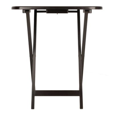 Simplicity, convenience, and quick set-up define the Cade 2-piece Oversize Snack Table Set. Each oblong table is generously proportioned for a casual meal at home in the family room or on the patio. When guests arrive, the set is perfect for serving chips and snacks in front of the big game. The tables come fully assembled, ready to open right out of the box, and when folded, will fit neatly into the closet. Finished in a rich Coffee, the tables are made of Solid and Composite wood.