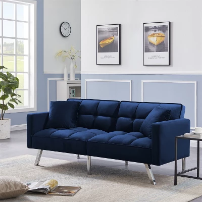 Morden convertible sofa bed. Whether you’re a busy professional in need of a perfect small space solution for your home, or cool and functional furniture for your dorm or first apartment,this sofa couch is your perfect choise. Our unique and functional sofa sleeper converts easily and quickly from a sofa to a lounger, to a full-size bed. Founded on a solid and manufactured wood frame with metal mechanisms & metal legs for durability and strength. Design with soft and comfortable velvet fabric to add comfy and speciosity. 【Comfortable Sofa Bed】 The sleeper couch is filled with thick foam with built-in springs to make your upholstered sofa comfortable and stretchy. The sofa cover is made of velvet fabric, which is soft to the touch. Give you the most comfortable experience. 【Upscale Material】This Futon sofa bed is covered with velvet,which is very soft and comfortable to touch,like baby skin. It’s very easy to care and will not wrinkle or fade. Contemporary design for your office or living room. 【perfect Structure】The frame of this futon sofa bed is solid wood and manufactured wood. Weight capacity reaches 600 LBS. Perfect additional for your home and office.