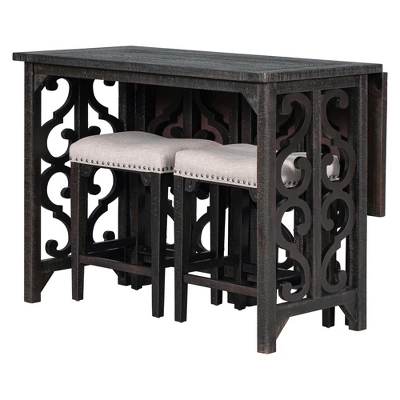 The retro 3-piece counter height dining table set consists of a folding dining table and two saddle stools. The copper nails around the edge of the soft linen seat and the unique curved molding under the seat add a touch of elegance to this simple stool. The style of this kitchen table set belongs to the rustic style or industrial home style, which can be applied in various situations and can accommodate 2 people, kitchen, dining room, restaurant, or coffee shop, featuring a perfect decoration for domestic use.