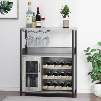 - MULTIFUNCTIONAL WINE CABINET: Our wine rack table includes 3 detachable wine racks for 12 bottles of red wine, a removable wine glass holder that sorts up to 9 glasses, and a closed cabinet with a mesh door to store wines of various shapes while providing ventilation for your wine bottles.