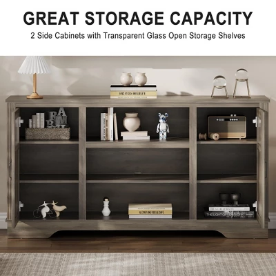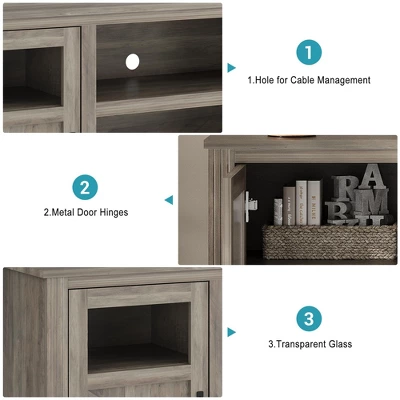 - 【Farmhouse TV Stand】This TV stand is crafted from engineered wood and modern transparent glass, blending traditional farmhouse style with modern aesthetics. Its clean lines and symmetrical design perfectly showcase the charm of the countryside and modern elegance.