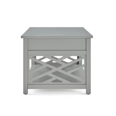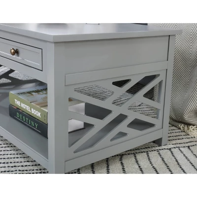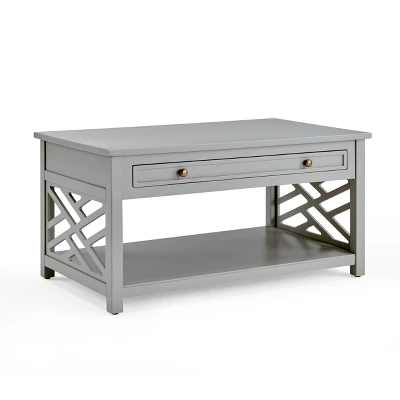 A fresh, clean collection that is versatile in any space. The open-detailing on each side of the Middlebury Wood Coffee Table is airy and offers a unique look for your décor. The square pattern provides a modern look while the simplicity still offers a traditional look and feel. One drawer and one shelf provide plenty of storage space and the neutral color will be a perfect match for any decor. The Middlebury Wood Coffee Table is the perfect accent piece for any room in your home!