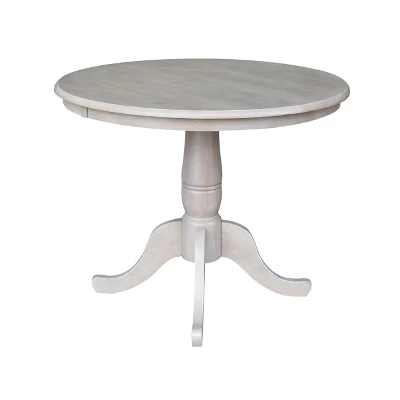 For those who appreciate high quality wood furniture with a traditional and elegant look. International Concepts home furnishings will complement any décor. This Dining Table is made of solid wood ensuring years of use. This round table features a butcher block top and a pedestal base with four feet for maximum support. It has a beautiful weathered gray finish. The gathering height table measures 36″ W x 36″ D, and is available in standard dining height, counter height, and bar height options. The standard dining height table is for use with dining chairs and is 28.9″ H. The counter height table is used with counter height stools and is 34.9″ H. The bar height table is 40.9″ H and is used with bar stools. This Solid Wood table ships ready to assemble.