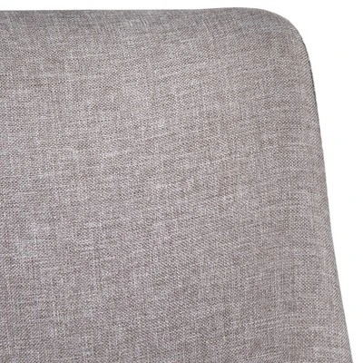 - Walnut finish, upholstered stools in a gray linen-like fabric