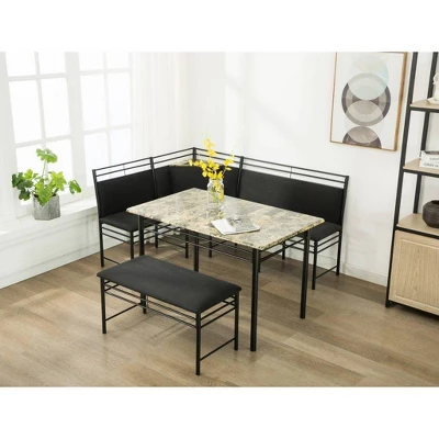 - Includes table, corner chair, and backless bench