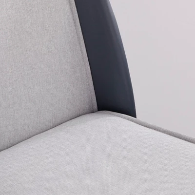 - Two-tone upholstered chairs in Navy-Blue faux leather and Gray linen-look fabric
