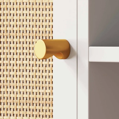 With its bright white finish along with its chic brass gold metal accents, Mina creates interest and appeal to any room. Add houseplants, books, and other decorative accents on the flat top of the entertainment cabinet to amplify your style. The recommended maximum TV size (diagonal) is 55″.