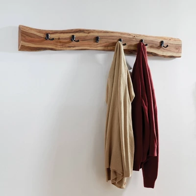 Mid-century meets Modern Industrial with these natural live edge table tops and hairpin metal legs. Each tabletop is unique; no two tops will be exactly alike. This set includes a 48″ wood bench and a 6 hook coat rack. Constructed of natural acacia wood, a clear natural finish embraces the beautiful features of each piece of wood. The knots and cracks add to the wood’s character.