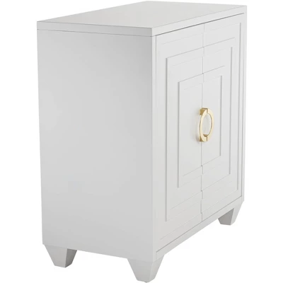 Adjustable shelving adds valuable storage to the stylish presentation of this two-door accent cabinet. Its door fronts feature a dimensional concentric square motif in a white finish that blends crisp, clean style to the piece. Round gold hardware delivers smooth, contrasting curves and a touch of warmth. Tapered block feet complete this stylish, modern design.