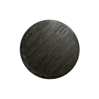 A trestle style base adds rustic depth and detail to this impressive five-piece dining set, which features a round tabletop and four comfortable chairs. Offering a refined edge to rustic decor, this inviting set features an antique black finish with light distressing that creates a sense of vintage authenticity. Chairs boast rolled backs with linen-look fabric upholstery and button tufting that ensure comfort and support perfect for relaxing over a delicious brunch or dinner.