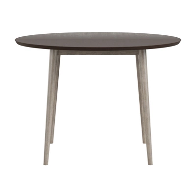 The Hillsdale Furniture Mayson 5-Piece Round Dining Set is a combination of neutral earthy tones. The dining table features an overall Gray finish with a Chocolate finish top and the spindle back mid century modern chairs are accented by a tapered wood seat in a dark chocolate finish. Outfit your cozy dining room or eat-in kitchen with the Mayson 5-Piece Dining Set and let the good times begin. Assembly required.