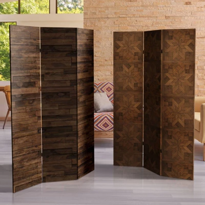 Hardwood flooring is desirable not only for its strength and durability, but also for its beauty and natural allure. The traditional pattern on one side and the ornate parquet pattern on the other highlight the true beauty of hardwood flooring. The rich walnut hue makes this room divider a versatile decorative accent.