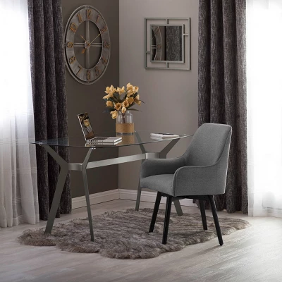 The mid-century inspired design of the ArchTech Dining Table/Desk by Studio Designs Home makes it a sleek and elegant addition to your home. The boomerang shaped legs have a powder-coated finish that resists scratching. The thick, clear tempered glass top floats over the angled legs making it perfect for small spaces. The modern, simple lines of this table and handsome finish make it a stylish addition to your dining room or office.