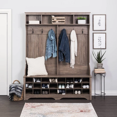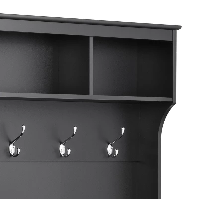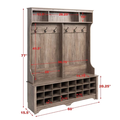 Organize and style your entryway with the Prepac 60″ Wide Hall Tree. Standing at 77″ tall and 60″ wide, this hall tree will provide all the storage space needed for your entryway belongings. Store your larger items in the 3 upper compartments, and hang your jackets, scarves, purses and hats on the 6 strong double coat hooks. A wide bench, with plenty of room, sits on top of 24 individual shoe cubbies. Each shoe cubby is spacious enough to hold a pair of size 13 men’s shoes, keeping them neatly stored and out of the way. The Prepac Hall Tree’s sleek design fits in with all decors and provides the essential storage space you need. Constructed from non-toxic, CARB-2 compliant laminated composite woods with a sturdy MDF backer. Ships Ready to Assemble, includes an instruction booklet for easy assembly and has a 5-year manufacturer’s limited warranty on parts. Manufactured in Canada and meets all North American safety standards.