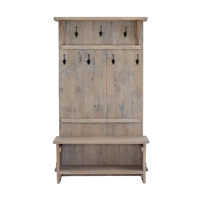 Organize your entryway, mudroom or living space with this gorgeous mango wood hall tree. The hall tree is both beautiful and functional, providing ample storage and style for your home’s entryway or hallway. This hall tree has a minimalist look made from solid mango wood. The driftwood stain highlights the subtle imperfections such as knots and cracks that are part of the wood’s character. This versatile piece features a bench for you to comfortably sit and take off your shoes for storing on the shelf underneath. A large upper shelf allows you to display hats or other items, while the seven metal coat hooks provide enough space for neatly hanging your jackets, scarves, umbrellas, or handbags.