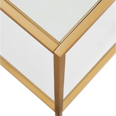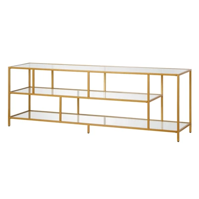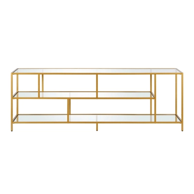 A must-have for living areas and entertainment spaces, this TV stand sets the stage for the big game, a movie marathon, or that season finale everyone’s been talking about. Crafted from steel, it strikes a clean-lined silhouette and boasts a metallic finish and glass shelves for a look that blends with nearly any color palette.Features : Hand crafted brass finish is applied to the steel frameFeatures 3 clear tempered glass shelvesWeight capacity is 75 lbs.Accommodates most flat-screen TVs up to 70 inches. Made from premium metal and tempered glass this media console can support up to 75 LBS.Premium materials have been used in the making of this productSpecifications : Product Weight : 84.2 lbsFrame Material : Steel/Glass
