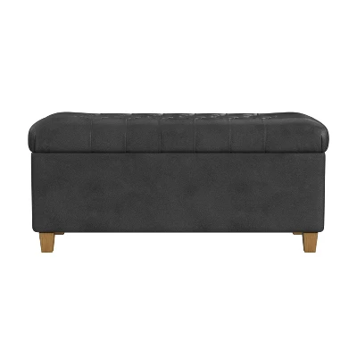 This black faux leather tufted storage bench provides a variety of home décor options. Use it as a coffee table ottoman in a living room to serve guests. Position it in a family room to relax feet on after a long day. Place it as an end of bed bench to hold pillows and blankets. With wood legs in a honey oak finish, durable black faux leather, and a hinged lid for easy access, this large tufted storage bench is a premium addition for any home. Easy to assemble and maintain.