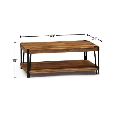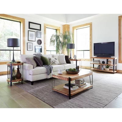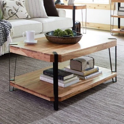 Industrial-styled Ryegate features solid wood tops with wood veneers. These tables make a strong industrial modern statement in your living space. Each tabletop is unique; no two tops will be exactly alike. Constructed of natural acacia wood. Each of our live edge products includes nylon floor protectors. The knots and cracks add to the wood’s character. A clear natural finish enhances the beautiful features in each piece of wood. The Coffee Table will be the signature piece and complement the decor in your home. This beautiful piece of furniture will make a statement in your living space.