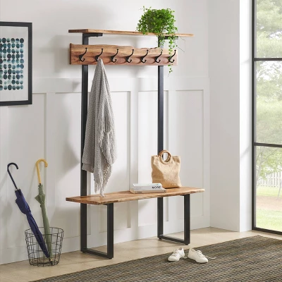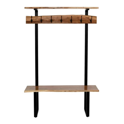 Style your entryway, living room or mudroom with this gorgeous natural acacia wood hall tree. This versatile piece combines seating and storage into one, making it an ideal option for optimizing your space. Each piece is constructed from acacia wood with live edge and metal strap legs. The live edge shape will vary on every piece due to the unique features of the natural wood. No piece is exactly alike; the subtle imperfections such as knots and cracks are part of the wood’s character. A clear natural finish enhances the beautiful features in each piece of the solid acacia wood. With a modern rustic design, this hall tree will add both style and function to your home.