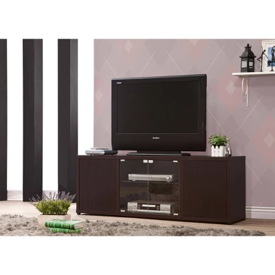 Expertly crafted, this TV console is perfect for casual home entertainment. It provides ample storage space to keep all your essentials in one place. Its simple silhouette is accentuated by a deep cappuccino finish and eye-catching silver embellishments. Push-to-open glass doors add a pleasing touch of convenience. Crafted from materials of the highest quality, this console exudes strength and durability.