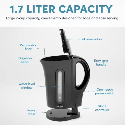 This 1.7 liter electric water kettle from Aroma features one-touch operation. The convenient cordless power base and the drip-free spout make for simple serving. The Strix technology is world leader in kettle controls for performance and safety. The kettle body is sleek and stylish with an easy to read water level window. This stylish kettle is a great addition to your kitchen.