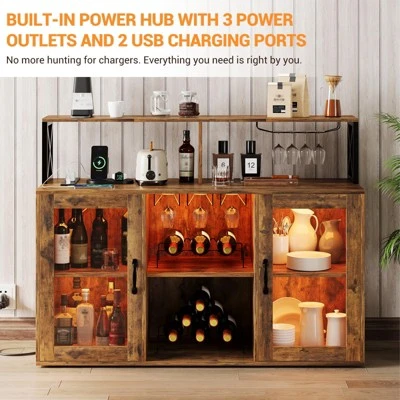 - Elevate your entertaining experience with our innovative bar cabinet, equipped with three outlets and two USB ports. This convenient feature allows you to charge essential appliances like coffee makers, juicers, bar accessories, and even your phone. No more searching for multiple power strips or chaotic cords cluttering your space. The design enhances your lifestyle, making it easier to enjoy your favorite beverages or entertain guests