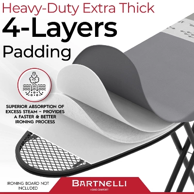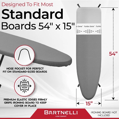 If you’re tired of flimsy, patterned covers and just want something solid, sharp, and built for the long haul—here’s your answer. The Bartnelli Ironing Board Cover and Pad, now in Solid Gray, is all about no-nonsense function, durability, and smart European design.Crafted in the Netherlands with the latest patented technology, this cover brings together thick, scorch-resistant cotton and a breakthrough: the Park Zone. Ever wish you could put the iron down for a moment—take a call, check on the kids, grab a coffee—without rushing? Now you can. The Park Zone is woven with steel right into the cotton, allowing you to set a hot iron down flat for up to 10 minutes—no scorching, no panic. Got pulled away for longer? Even up to 72 hours, you’re still safe.Bartnelli’s Turbo Zone adds another level of convenience. Glide your iron a few times over the Turbo Zone and notice the difference—the iron just moves easier. It’s real, it’s fast, and it helps cut ironing time in half. No more fighting with sticky spots or stubborn fabric.The fit is engineered for real life: A full elastic edge plus two loop straps keep your cover tight on boards up to 54″x15″—and even those that are a bit larger or smaller. The solid gray design is clean, modern, and right at home in any laundry setup. No pattern, no distraction, just a crisp, finished look.Layered for extra thickness, the premium cotton stands up to heat and wear. The cover is built for easy on, easy off—changing or securing it is a breeze, not a wrestling match. Foldable board? No problem—the cover stays put, every time.And when you need help, Bartnelli’s U.S.-based support team has your back. Quick answers, easy returns, and a trusted warranty mean you’re never left guessing.Skip the patterns and pick solid performance. Bartnelli’s solid gray ironing board cover gives you everything you need—nothing you don’t. European-made, smartly designed, and ready for years of laundry days.