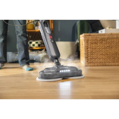 - SPINNING, SCRUBBING STEAM POWER. Two rotating pads spin up to 230 RPM to deliver true steam scrubbing power on tough, stuck-on messes. Steam ready in 20 seconds.