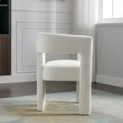 - Contemporary boucle dining chairs, featuring a curved silhouette and open-arm design, perfect for adding a modern touch to any dining space.