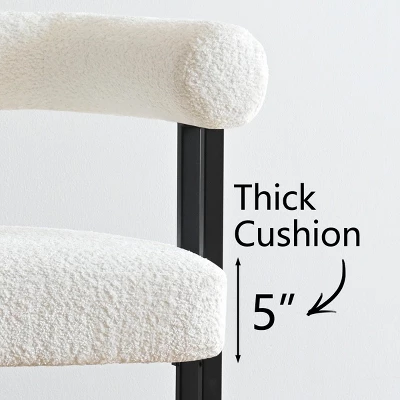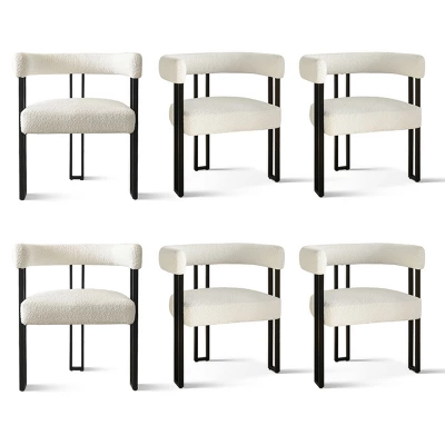 Upgrade your dining experience with this set of 6 modern boucle dining chairs, designed for both luxury and functionality. Featuring a sculptural curved backrest and open-arm design, these chairs provide exceptional ergonomic support and a stylish, contemporary look. The soft boucle fabric upholstery adds a plush, textured feel, making them an inviting addition to any dining room, kitchen, or living space.Built with a sturdy matte black metal frame, these chairs ensure lasting durability and stability, while their minimalist yet bold silhouette makes them a perfect fit for modern, Scandinavian, and industrial interiors. The generously padded seat and armrests offer enhanced comfort, making them ideal for long dinners, entertaining guests, or simply enjoying a cozy meal at home.With a compact height of 28.5 inches, these chairs tuck neatly under most dining tables, saving space while maintaining a sleek, sophisticated look. Whether you’re furnishing a formal dining area or creating a stylish breakfast nook, these upholstered armchairs blend elegance with everyday practicality.