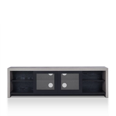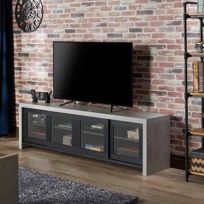 Modern entertaining calls for nuanced vibes that reflect on style and add function. Designed with a cozy cement-like frame the Homes: Inside + Out Briggin Industrial 70″ Tv Stand in Black by HOMES: Inside + Out is a wonderfully unique creation. The doors conveniently slide and feature glass inserts so you can see through to your belongings. Store electronics, movies, and more in the multiple roomy shelves and enjoy the charm and practicality of this piece.
