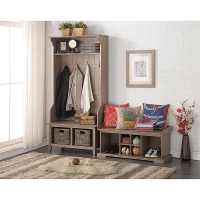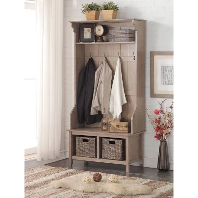 The Carolyn Hall tree is bursting with storage options wrapped in a package full of cottage charm. This entryway hall tree makes it easy to keep your halls, mudroom, or entryway organized. Four hanging hooks are ready to hold jackets, purses, and scarves. An upper shelf is perfect for storing gloves or hats. Finally, two open storage cubbies each come with a basket – stack it full of mail and keys or other small accessories. For the perfect pair, be sure to also add on the matching Carolyn Entryway Bench (sold separately).