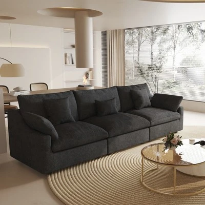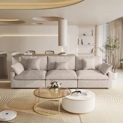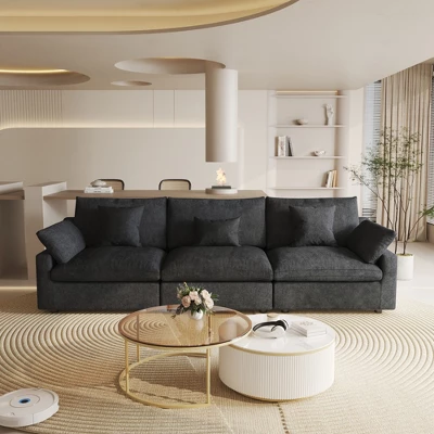 Please Read this BEFORE ORDERING!!![Put the Sofa Covers] the sofa item is the gray color when you open the boxes, But, please do not worry, all seat need to be put the sofa covers then will become right color.[Separate package delivery] Each seat is shipped in a separate package, so please be patient as your order may be delivered by several packages.The Skycloud sofa is designed to provide “cloud-like comfort.” Its filling combines sponge, cotton, and down in the perfect ratio, making it soft yet resilient, which ensures comfort without sagging. The Skycloud sofa also has a modular design: you can freely combine the seats, arrange or remove the arm cushions, and choose from three modules: corner, armless, and ottoman. These features offer endless possibilities for arrangement. The Skycloud sofa is designed to provide “cloud-like comfort.” Its filling combines sponge, cotton, and down in the perfect ratio. Thanks to this filling, the Skycloud sofa is soft yet resilient. In addition, the Skycloud sofa is highly modular: you can freely combine the seats, and arrange or remove the arm cushions. Besides, you can choose from three modules: corner, armless, and ottoman. These features offer endless possibilities for arrangement. BY other word: Elevate your living space with this expansive this cloud sofa, designed for ultimate comfort and versatility. The sofa features a sturdy solid wood frame, ensuring durability and long-lasting support. Upholstered in premium hemp-blend fabric, it offers a dense yet soft texture, combining wear resistance, moisture resistance, and a static-free experience. The feather-filled cushions provide a plush, cloud-like seating experience, while the modular design allows you to customize the layout to suit your space. The included convertible ottoman adds extra functionality, perfect for lounging or additional seating. For added convenience, the removable and washable covers make maintenance a breeze. With its generous seating width and depth, this sofa offers ample space to stretch out and relax, making it the perfect centerpiece for your home. Upgrade your comfort with this stylish and practical sectional sofa today!