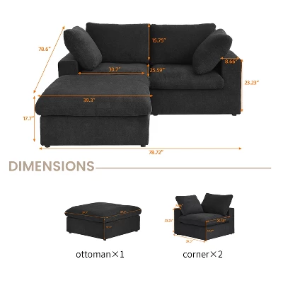 - 【Including】2 Seater Sofa + 1 Middle Sofas + 1 Ottoman. 2 Pillows. Overall Size: 120.45 “W x80.3 “D x 23.23 “H. Sofa legs: 1.18” H. This item’s simple and generous design, with coordinated color schemes, is suitable for various decoration styles.There are legs and Connect buckles