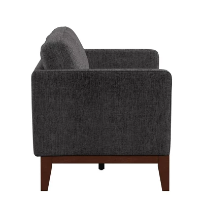 Add stylish seating to your living space with the Clyde Linen Upholstered Sofa by Inspire Q. The sofa features a sleek silhouette with slightly tapered legs for a quintessential mid-century aesthetic. The base has a rich walnut wood finish for a touch of contrast and a luxurious feel.