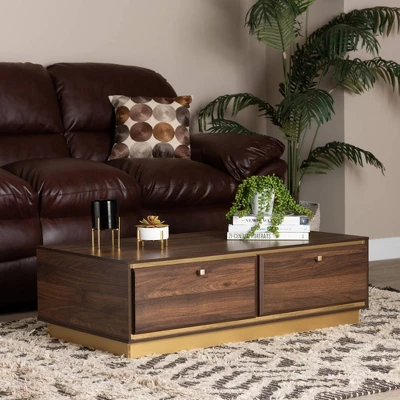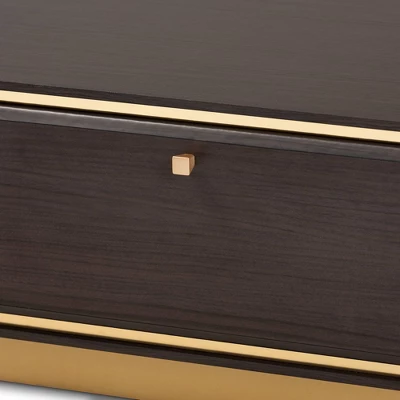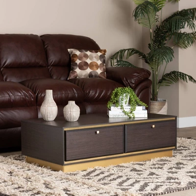 Injected with modern glamour, the Cormac coffee table is sure to become a bold anchor point in any layout. Made in Malaysia, this handy piece is comprised of a sturdy wood frame adorned with metal accents. Two drawers offer convenient storage space, while the open shelf serves as a handy display for books, movies, and decorations. The Cormac requires assembly and features tapered drawer knobs, which accentuate the luxurious embellishments of the piece. Updated for the modern era, the Cormac coffee table grants a pleasant aura to any space. Overall Dimensions: 12.20″ High x 41.30″ Wide x 21.70″ Deep; Drawer Dimensions: 17.20″ Wide x 11.00″ Deep x 3.90″ High; Open Shelf Space Dimensions: 39.30″ Wide x 3.90″ Deep x 8.20″ High; Base/Legs: 2.20″ High;