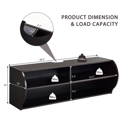 Our wall-mounted TV console will adds a touch of vanity and classiness to your home décor style. Designed with P2 standard MDF and engineered wood, our floating TV cabinet provides the heavy loading shelves to meet your daily storage needs. And the exquisite design cable hole offers a perfect wire management for all your items neat and organized. This contemporary wall-mounted TV shelf with creative design is perfect space-saving solution for your home and makes space utilization efficient.