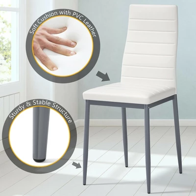 Add a fashion style to your kitchen or dining room with our stylish and functional 5-piece table chairs set. It includes a sturdy rectangle table and four stools. With durable and sturdy tempered glass and powder-coated steel construction, this set will last for years to come. Clear and bright glass top adds a modern feel and it is very easy to clean. The soft sponge-filled stools give you more comfortable sitting enjoyment during a long time family dinner. Whether you are looking for extra seating in your breakfast nook or dining room or use it as an entertaining station, this 5-piece set is the best choice. Buy yours today!