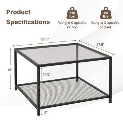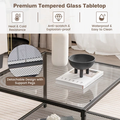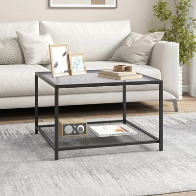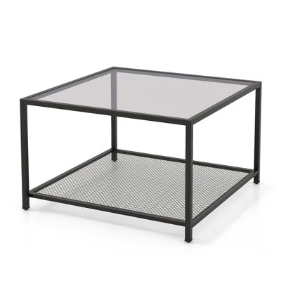 The square coffee table will be a perfect piece in your home! Crafted with 6 mm thick tempered glass top and sturdy metal frame, the coffee table is high-temperature resistant(up to 302℉) and ensures a rugged structure. Besides, the waterproof surface requires less maintenance. For storage convenience, the coffee table features a wide tabletop and mesh shelf to suit different needs. Blending a chic black frame and a sophisticated grey glass top, the center table is a charming complement for living room, bedroom, or office.