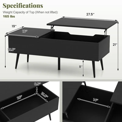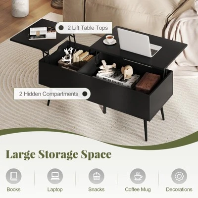 Elevate your living room decoration with this innovative lift top coffee table that combines functionality and elegance seamlessly. The desktop can be effortlessly raised to a height of 21”, offering a versatile surface for work or dining. The soft-close gas struts ensure a safe and smooth lifting mechanism for added convenience. With 2 lift table tops and concealed compartments, this table provides ample storage space for your books, laptop, snacks, coffee mug or decorations. The sturdy 5-point support system, including 5 metal legs and non-slip foot pads, ensures stability and durability. Its multi-functional design allows it to transition from a stylish coffee table to a practical working desk effortlessly. The modern chic style, characterized by clean lines and contemporary aesthetics, adds a touch of sophistication to any room.