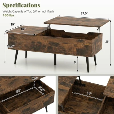 Elevate your living room decoration with this innovative lift top coffee table that combines functionality and elegance seamlessly. The desktop can be effortlessly raised to a height of 21”, offering a versatile surface for work or dining. The soft-close gas struts ensure a safe and smooth lifting mechanism for added convenience. With 2 lift table tops and concealed compartments, this table provides ample storage space for your books, laptop, snacks, coffee mug or decorations. The sturdy 5-point support system, including 5 metal legs and non-slip foot pads, ensures stability and durability. Its multi-functional design allows it to transition from a stylish coffee table to a practical working desk effortlessly. The modern chic style, characterized by clean lines and contemporary aesthetics, adds a touch of sophistication to any room.