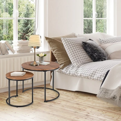 Our nesting coffee tables keep a good balance between practical use and antique design! The ingenious round design makes it combined at will to satisfy different needs. You can use this coffee table set separately or stack together. When not in use, the small table can be stored under the large one. Besides, the compact design is perfect for small space and works equally well near the bed or sofa. The wide tabletop is convenient for you to take and put daily things. The coffee table set is easy to assemble and clean. Designed with vintage style, this nesting table coffees are charming complement to your bedroom and living room, which can be used as a side table, end table, nightstand, etc.