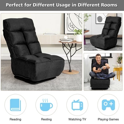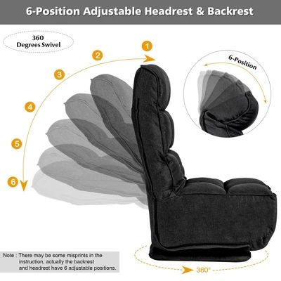 Our adjustable folding floor chair is your ideal company with great sitting experience! The gaming floor chair is constructed with steel frame, which is durable and will not easily deform, thus providing a long service life. 6-position adjustable backrest and headrest enable you to adjust the chair positions to meet your different needs of seating, leaning and reclining. With premium hinge system, the adjustments of back and headrest is smooth and easy. Upholstered with high-density sponge and PP cotton, this floor sofa offers great sitting experience. Besides, the 360-degree swivel base with a protective cover rotates smoothly without scratching your floor. Note: There may be some misprints in the instruction, actually the backrest and headrest have 6 adjustable positions.