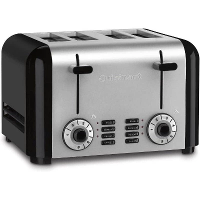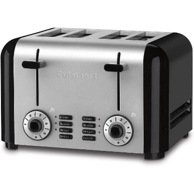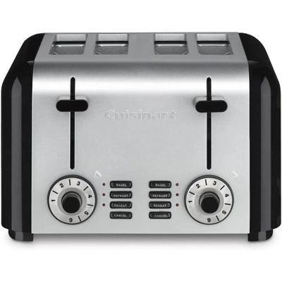 Bring the classical beauty and powerful performance of the Cuisinart home with this timeless classic. A blending of stainless steel and black painted steel makes this toaster a must have for those who desire classical culinary design.The Compact Stainless Cuisinart 4-Slice Toaster brings retro classic design to your home and delivers performance with powerful features such as reheat, bagel and defrost functions.Clean up is easy with the removable crumb tray. It even has a cord wrap underneath the unit to manage unsightly power cords while not in use.