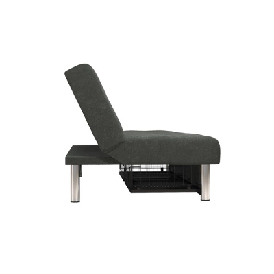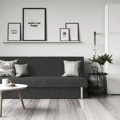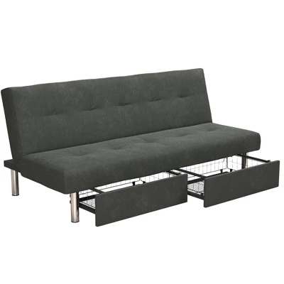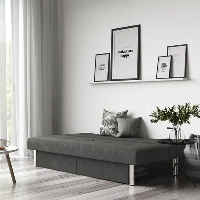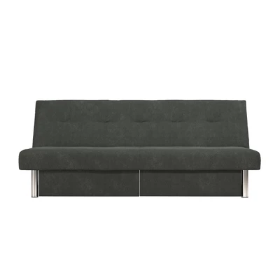 Make the most of your living room space with the Sola convertible sofa futon with space saving storage compartments. With its chrome legs and upholstered in rich microfiber, this sofa futon creates a stylish and sleek look. The Sola offers functionality, support and durability. The storage compartments underneath pull out to reveal storage for books, blankets, pillows, and more. The multi-position back converts the futon from a lounger to sleeper, perfect for overnight guests. Enhance your living space with the Sola Futon with Storage!