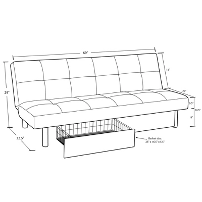 - Futon dimensions: 69″L x 32.5″W x 29″H. Weight limit: 600 lbs.