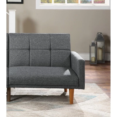 Elevate your living room with this stylish and versatile transitional sofa. Designed with a tufted polyfiber fabric in a modern blue-grey tone, this sofa seamlessly converts into a comfortable bed, making it perfect for guests or relaxing. The sturdy wooden legs provide stability and a contemporary touch, while the well-cushioned seating ensures maximum comfort. Ideal for compact spaces, this sofa is the perfect blend of functionality and style.