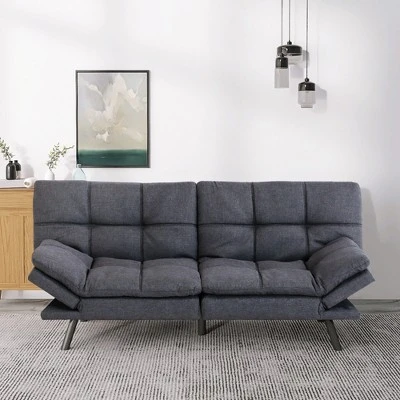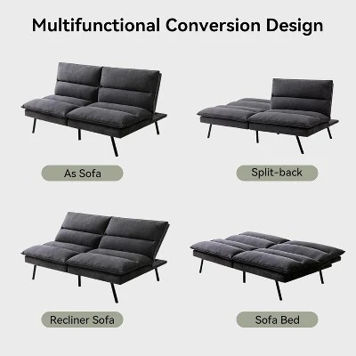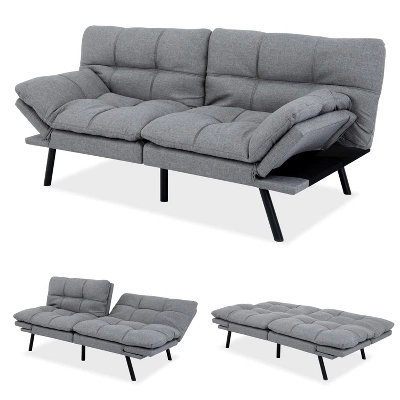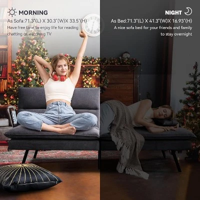 This versatile convertible sofa bed combines premium comfort and space-saving functionality,making it perfect for small apartments,guest rooms,or home offices.The 3-inch memory foam and supportive filling ensure a restful sleep,while the adjustable backrest (120¡ã-180¡ã) and split design allow for customizable lounging or sleeping positions. Upholstered in soft,durable linen fabric and supported by sleek chrome legs,it effortlessly blends style with practicality. With a 600 lbs weight capacity,it easily transitions from a 71″ sofa to a spacious bed in seconds.Quick assembly (15 minutes) and a modern design make it an ideal choice for any living space