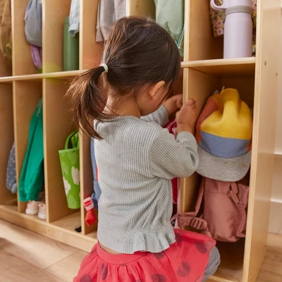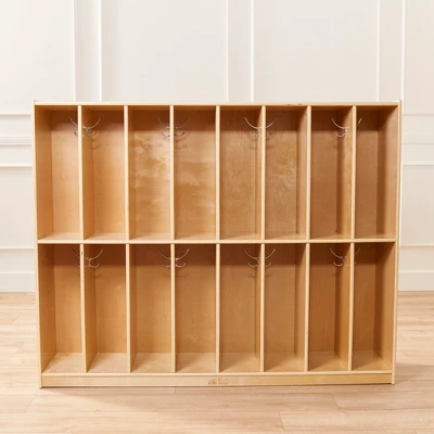 Provide a more efficient and productive learning environment with the ECR4Kids 16-Section Slim-Fit Coat Locker keeping it organized and clutter-free. The wooden locker features 16 long compartments with 16 double coat hangers to hang sweaters, backpacks, and umbrellas. Give children their own separate cubby storage to keep art projects, homework, and personal belongings. Use in a playroom to manage dress-up clothes, costumes, accessories, hats, gloves or in an entryway mudroom as a convenient place to grab coats and shoes as you head out the door. The low-profile open-face shelves provide visibility and easy access, promoting independence in kids as they take responsibility for their belongings and clean up. Having a dedicated space reduces clutter, enhancing classroom management. The drop-and-go storage is constructed from sustainably harvested birch plywood with a tough UV lacquer that seals the wood surface and resists scratching. A UV inhibitor makes furniture resistant to ultraviolet light and yellowing. Natural birch plywood is extremely durable and will hold up to everyday use in a preschool and is great for the home. Combine the Montessori storage with other ECR4Kids Birch Collection furniture pieces to complete the space. Plenty of storage: 16 sections each with double hooks for jackets, backpacks, lunchbags, and more! | 16-Section Narrow Coat Locker | Attractive natural birch wood finish | perfect for classrooms, daycares, libraries and more